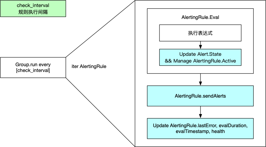 Prometheus会根据group.interval (下图的 check_interval)定时执行AlertingRule(执行Eval方法),然后发送告警到Alertmanager,最后再更新AlertingRule的状态、Group的状态。